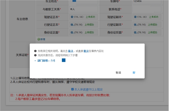 3.找到校内机动车录入申请,按照申请表填写相关人员信息,填写完成后提交申请。如有更换车牌请在关系证明栏备注更换车牌写上新旧车牌号。